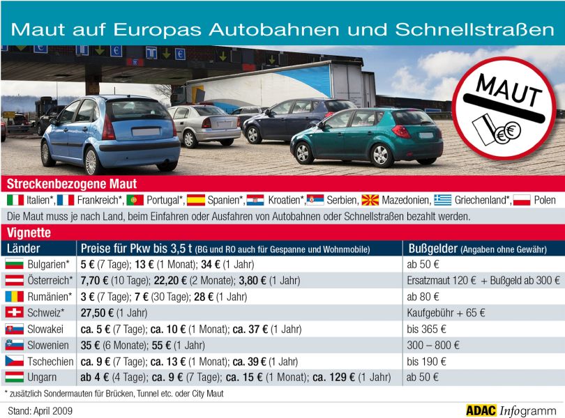 Generell gibt es in Europa zwei verschiede Systeme zur Erhebung der Straßengebühr. Entweder muss für die Nutzung eine Vignette gekauft werden oder die Maut wird abhängig von der gefahrenen Strecke erhoben. Für Schnellstraßen und Autobahnen benötigen Autofahrer in der Schweiz, Österreich, Bulgarien, Rumänien, Ungarn, der Slowakei, Slowenien und Tschechien eine Vignette. Je nach Streckenlänge wird die Straßennutzungsgebühr in Italien, Frankreich, Spanien, Portugal, Griechenland, Kroatien, Serbien, Mazedonien und Polen erhoben.