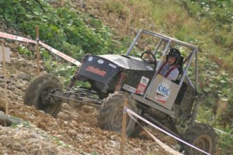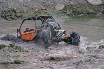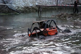 Er wollte sich aber nicht nach vorne bergen lassen, um den nachfolgenden keine Spur zu ziehen. Also wieder rückwärts durchs Wasser. Dabei zog er sich den hinteren rechten Reifen vom Rad, und der Kran musste den „X-treme“ herausheben. Kurz vorm Absetzen, rund einen Meter über dem Boden, riss der Bergegurt und das Gefährt knallte auf die Erde. Der anschließende Radwechsel half nichts, der Motor muckte nur noch anstatt Vortrieb zu leisten. Marlon konnte die letzte Sektion nur noch anfahren, Christof war so der Sieg und damit auch der Meistertitel in der Klasse Prototypen sicher.
