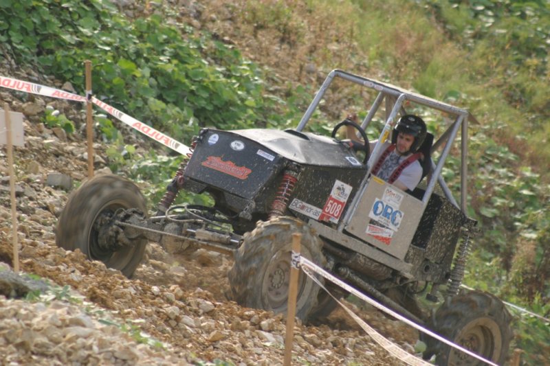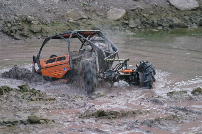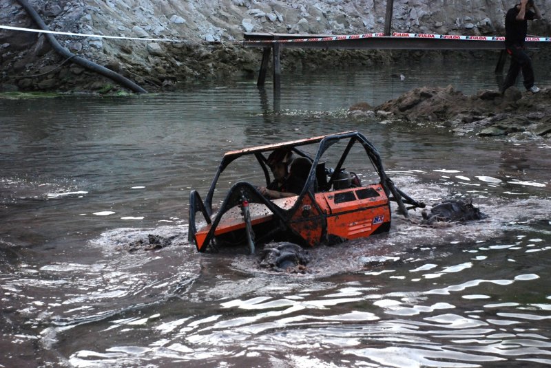 Der Meistertitel in der „Königsklasse“ musste sich in Gschwend entscheiden. Marlon Lewandowsky vom SCC Bramsche hatte noch die Chance, Christof Schumann von der Tabellenführung zu verdrängen. Dazu musste allerdings ein Tagessieg her. Vater Dirk fuhr für Sohn Marlon die Sektionen im gemeinsamen Proto „X-treme“ vor. So auch in der letzten Sektion, Nr. 14. Hier ging es vor dem letzten Tor durch eine Wasserlache, die sich aber als See entpuppte. Der Untergrund war schlammig statt fest und bot keinen Grip. Dirk versuchte die Ausfahrt, doch nichts ging vorwärts.