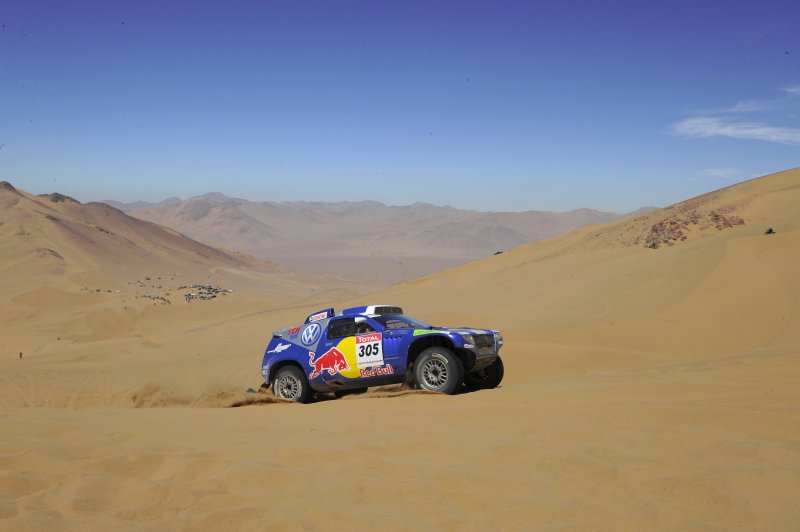 So schnell kann es gehen: Carlos Sainz und Michel Périn dominierten bislang die Dakar. Dann kam Kilometer 79 der gestrigen zwölften Etappe von Fiambala nach La Rioja und alle Chancen des Touareg-Teams waren vorbei. Der Spanier schildert das Geschehene so: „Plötzlich ist vor uns ein vier Meter tiefes Loch aufgetaucht. Wir sind reingestürzt und auf dem Dach gelandet. Ein BMW und Nani Roma konnten im letzten Moment noch ausweichen. Das BMW-Team hat angehalten und uns geholfen, das Auto wieder auf die Räder zu stellen. Mittlerweile war ein ASO-Arzt eingetroffen, der Michel Périn kurz untersucht und auf Grund einer Schulterverletzung die Weiterfahrt untersagt hat. Der RaceTouareg war soweit okay, der Motor lief. In dieser Situation haben wir natürlich auch Glück gehabt. Ich bin sehr enttäuscht und es tut mir sehr leid für das Team, dass wir draußen sind.