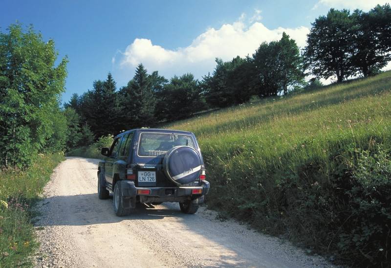 Die Schotterpiste schlängelt sich durch mehr oder weniger dichte
