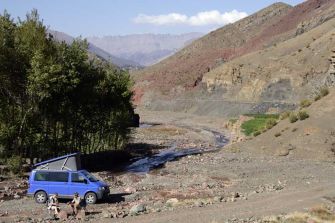 Auch wir sind von Marrakesch nach hier auf diesen Weg nordwestlich von Quarzazate, dem marokkanischen Pendant zu Hollywood,  aufgebrochen. Allerdings schon gestern. Wir sind schon einen Tag über Pisten gefahren und durch Flussbette gewatet, haben die letzte Nacht unser Camp in einem ausgetrockneten Wadi abseits der Zivilisation aufgeschlagen.