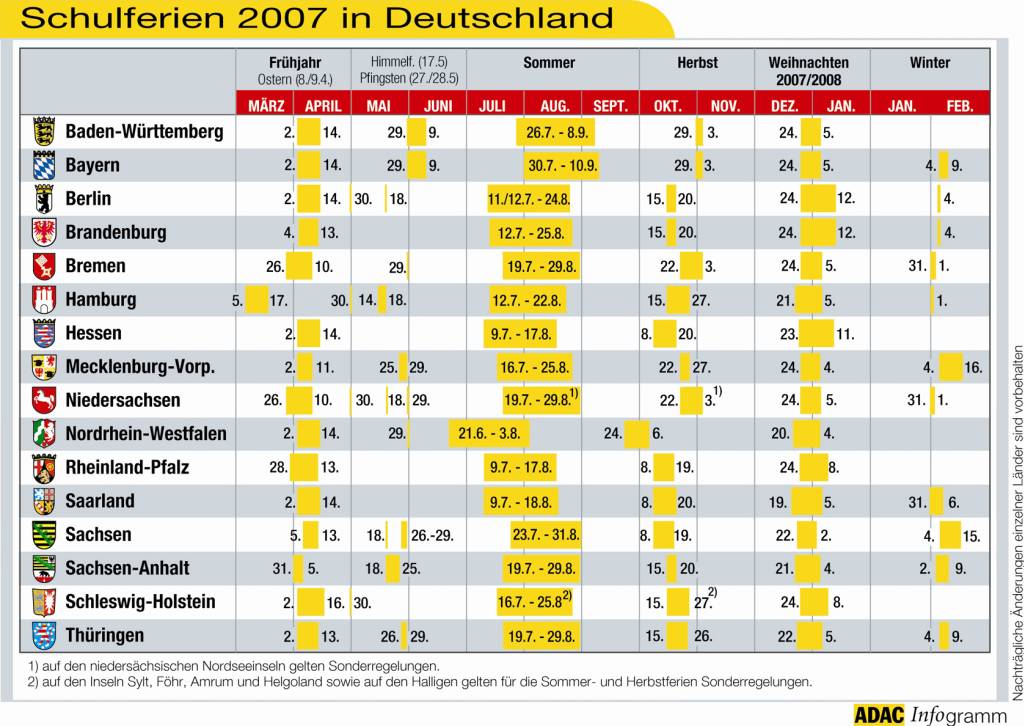 Wenn deutsche Schüler jubeln, stöhnen die Autofahrer. Vor allem die Sommerferienzeit sorgt auf Deutschlands Autobahnen häufig für lange Staus. Besonders die vier Samstage im Juli, aber auch das erste Augustwochenende, sind besonders staugefährdet. Wer unnötige Verzögerungen vermeiden möchte, sollte laut ADAC unbedingt während der Woche starten und gegebenenfalls eine Übernachtung auf dem Weg ins Urlaubsziel einplanen. Die ADAC-Übersicht zu den Ferienterminen 2007 in Deutschland hilft bei der frühzeitigen Planung.