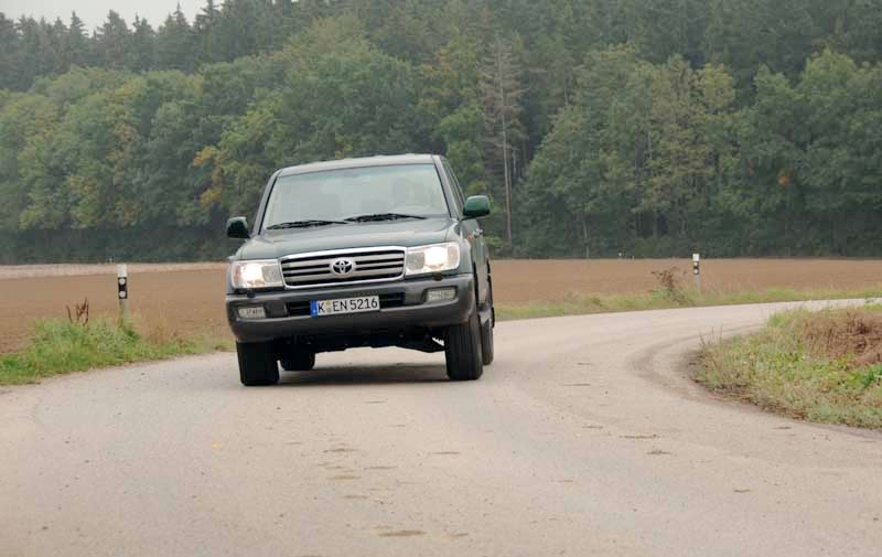Damit setzen sich die rund 2,6 Tonnen bei vehementen Tritt aufs Gaspedal nach kurzem Zögern des Wandlers recht spontan in Bewegung. Lässt man den Fuß unten, bleibt die Automatik auch ohne Aktivierung der entsprechenden Drucktaste im „Power"-Modus und wechselt zügig sowie mit geringen Drehzahlsprüngen in die nächst höhere Stufe. Rund 12,5 Sekunden vergehen, bis der LC 100 TD in dieser Manier die Hunderter-Marke auf dem Tacho erreicht hat, was angesichts des gewichtsintensiven Executive-Ausstattungs- paketes und der großen Stirnfläche des Toyota-Gelände- flaggschiffes ein respektabler Wert ist. Und auch die rund 180 km/h Höchstgeschwindigkeit lesen sich mit Blick auf die barocke Aerodynamik ganz akzeptabel. Aber ein wahrer Autobahnburner will der J100 ja auch gar nicht sein – zumal die Bremsen nach hitzigen Manövern fühlbar schwächeln. Seine Domäne ist das souveräne, gelassene Gleiten – auf asphaltiertem wie natürlichem Untergrund.