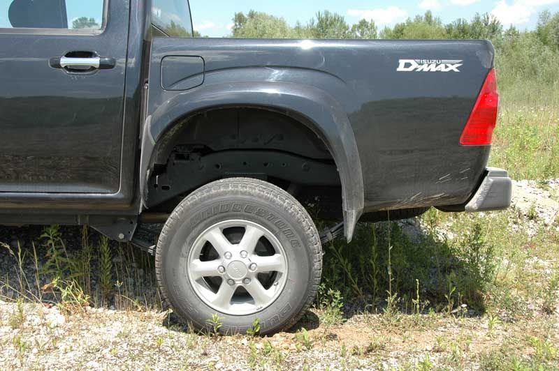 Isuzu D-Max 2.5D – Kernige Kompetenz - Seite 4Moderne Zeiten haben hinter dem markanten gestylten Gesicht mit hochkantigen Scheinwerfern und großem Kühlergrill sowie der charakteristischen Lufthutze auf der Motorhaube Einzug gehalten: Hier arbeitet ein kernig tönender Vierzylinder-Turbodiesel mit Common-Rail-Direkteinspritzung, zwei obenliegenden Nockenwellen und vier Ventilen pro Brennraum. Das 2,5-Liter Triebwerk stampft bereits ab Leerlaufdrehzahl kräftig los und zieht, wenn man es flugs und ohne Verhaspeln durch das lasterhaft langwegige Fünfgang-Menü der Schaltkulisse schafft, ohne Turboloch durch. Um die Ohren mit einer angenehmen Akustik zu verwöhnen und das optimale Kraftpotenzial des Aggregats stets zu nutzen, richtet sich der D-Max'ler kommod zwischen 2.000 und 3.000 Umdrehungen ein – stehen ihm hier doch auch die 280 Newtonmeter Maximaldrehmoment jederzeit zur Verfügung. Schaltfaule freut's, für den Zwischenspurt reicht in der Regel ein beherzter Tritt aufs Gaspedal. Das breite Drehzahlband bietet zudem ideale Voraussetzungen für ein starkes Fortkommen im Gelände. Der Allradantrieb wird elektrohydraulisch über eine Drucktaste im Armaturenbrett zugeschaltet, damit's bei der 4x4-Aktivierung bis 100 km/h nicht peinlich und schadenimmanent im vorderen Antriebsstrang kracht, wird selbiger durch eine Synchronisation im Verteilergetriebe entsprechend hochbeschleunigt. Eine zweite Taste aktiviert die Untersetzung. Beide Getriebe sind erfreulich geländeorientiert ausgelegt, sprich: Die Zahnradpaarungen der fünf Gänge weit verspreizt und das Reduktion kurz übersetzt. Dazu gesellen sich eben noch die Beweglichkeit der starren Hinterachse, eine ordentliche Bodenfreiheit von 25 cm vorne und 21,5 cm hinten sowie große Böschungswinkel (s. Tabelle).
