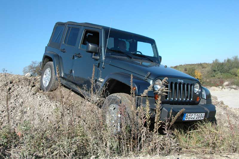 Jeep Wrangler 3.8 Automatik Unlimited Sahara – Bergziege für fünf Alpinisten18.10.2007 Unlimited heißt das Zauberwort, das aus dem aktuellen Jeep Wrangler einen echten Fünfsitzer macht. Doch an seinen Genen hat sich nichts geändert: Auch der Lange fühlt sich immer wohler, je weiter es ins Gelände geht. Es ist die zur Zeit wohl amerikanischste aller Wrangler-Motorisierungen, die vorne unter der langen Motorhaube unseres Testwagens säuselt: Ein 3,8 Liter großer V6-Benziner, kombiniert mit einer Vierstufen-Automatik deren letzte Übersetzungsstufe per Overdrive-Druckknopf elektrisch aktiviert werden kann – oder eben auch nicht.