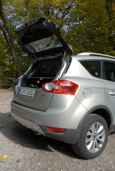 Ford Kuga 2.0 TDCi 4x4 – Fun Cruiser / Seite 6Im Heck bietet der Kuga einen 85 cm langen Laderaum, der durch Umklappen der geteilten Rückbank auf eineinhalb Meter anwächst und einen völlig ebenen Ladeboden hat. Praktisch auch: Der Zugang über die zweigeteilte Heckklappe, deren oberer Teil sich separat öffnen lässt. Für 28.5000 Euro ist der Kuga 2.0 TDCi 4x4 in der relativ komplett ausgestatteten „Trend“-Version zu haben, 2.000 zusätzliche Euro kostet das „Titanium“-Trim, das dann bereits Teil-Leder, sowie Regensensor, Fahrtlichtassistent, Tempomat und einen automatisch abblendenen Innenspiegel etc. umfasst. Für leistungshungrige SUV-Fans bringt Ford im Frühjahr 2009 den Kuga auch mit einem 2,5-Liter-Turbobenziner mit 200 PS und optionalem Automatikgetriebe.