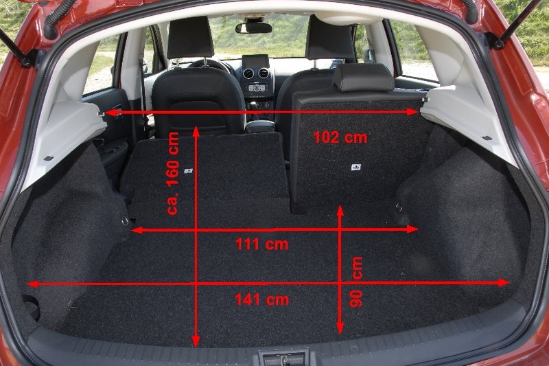 Den Pkw-Genen in der Qashqai Ahnenreihe entstammt die mit 161 cm für SUV-Verhältnisse relativ niedrige Karosserieform, deren Design an Golf und Co. erinnert. Mit einer Länge von 4,32 Metern trifft er genau ins Segment der kompakten Pkw und bietet eine entsprechende Innenraumgröße. Vier nomadisierndende Erwachsene finden samt dazugehörigen Reiseutensilien ausreichend Platz, wobei das Kofferraumvolumen mit 410 bis 1.513 Liter Fassungsvermögen großzügig ausgefallen ist.