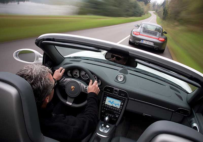 Porsche Carrera 4 / 4S – Ein Biss(-chen) mehrWer gerne ausschließlich selbst schalten mag, darf sich die 3.510,50 Euro für das 7-Gang-Doppelkupplungsgetriebe sparen. Sowohl sub- wie auch objektiv spart er aber dann am viel zitierten falschen Ende: Denn das PDK kann erstens schneller – weil ohne Zugkraftunterbrechung – schalten Und macht zweitens – dank Drucktasten-Selektion – beim engagierten Boxer-Pferde-Treiben einfach mehr Spaß. Lassen wir die 0,2 bis 0,4 Sekunden, die man damit gegenüber dem manuellen 6-Gang-Menü zügiger auf Tempo 100 ist, mal außen vor: Es ist schlichtweg angenehm, sich im schnell durcheilten Geläuf mit dem linken Fuß abstützen und dennoch fleißig im Gängemenü quirlen zu dürfen. Und wer sich die Zeit gerne öfter mal auf einer Rundstrecke vertreibt, wird die „Sport Plus“-Taste mit der impliziten „Launch Control“ (Aufpreis 1.094,80) schätzen lernen: Bremse treten, Gaspedal kurz und heftig durchtreten um die Ausgangsdrehzahl von 6.500 U/min einzuloggen, Bremse loslassen und mit einem perfekten Rennstart davonschießen. Mit dem Carrera 4S Coupé hat man die 100er-Marke damit nach schlappen 4,3 Sekunden passiert, was ja durchaus ein breites Lächeln auf die Lippen zaubern kann...
