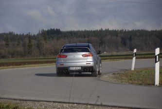 Mitsubishi Lancer Evo – Lass die Gerade Kurve sein! - Seite 3Schnell in den dritten runterschalten und den rechten Fuß abwinkeln: Push the pedal to the metal – und die 1.180 Hufe (lassen Sie den Taschenrechner stecken: es sind 295 PS) krallen sich via des elektronisch geregelten Mittendifferenzials traktionsoptimal über die vier Gummipneus in den Asphalt. Jetzt heißt es, ein Auge dem Straßenverlauf und das andere dem Drehzahlmesser zu widmen. Dann bei 7.000 Umdrehungen den vierten Gang reinhauen und schnell wieder die Hand ans gut konturierte Lenkrad, um die Nase mit der präzisen Lenkung nachdrücklich durch die nächste Biegung zu zirkeln und dabei genau den Scheitelpunkt zu treffen. Hoppla, sagt das kernig-sportlich-straff abgestimmte Fahrwerk: Da hat das Straßenbauamt aber gesündigt! Die Asphaltnarbe war deutlich, brachte den Evo aber nur für einen Wimpernschlag und nicht wirklich beängstigend aus der anvisierten Linie. Enge Kurve voraus, melden die Augen. Der rechte Fuß steppt vor dem ersten Lenkeinschlag auf das mittlere Pedal und die Zangen der Brembo-Bremsanlage packen feste zu, sorgen für eine beeindruckende Verzögerung der knapp über 1,5 Tonnen Leergewicht. Jetzt wünsche ich mir dann doch mal die Evo-Variante mit dem agilen Sechsgang-Doppelkupplungs-Getriebe inklusive der Schaltpads am Lenkrad. Damit flutschen die Zahnradpaarungen erstens einfach zügiger ineinander und zweitens sind selbige noch etwas beschleunigungsintensiver gespreizt.