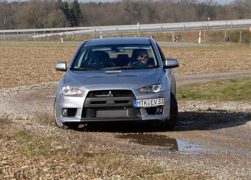Mitsubishi Lancer Evo – Lass die Gerade Kurve sein! - Seite 5Das System arbeitet so präzise und schnell, dass sich der Evo nur durch gröbste Lastwechselprovokation auf schotterigem Untergrund zum Drift überreden lässt. Dank der sportlichen Sitzposition in den serienmäßigen Recaro-Möbeln mit überzeugendem Seitenhalt und passender Lenkradhaltung hat man ihn dabei aber jederzeit kontrolliert im Griff. Ein sensibles Popometer und eine Portion Fahrtalent vorausgesetzt... Auf trockenem Asphalt rutscht dieses Rallye-Basismodell im Extremfall mit leichtem Powerslide über alle Viere Richtung Kurvenausgang. Im Normaltempo – das wir im Alltagsverkehr jedem ans Herz legen – zieht der Mitsubishi seine Spur wie auf Schienen. Wer moderat unterwegs ist, darf sich dennoch der Aufmerksamkeit seiner Umwelt „erfreuen“: Mit der aggressiven Spoileroptik – Schaufel vorne, „Biertheke“ hinten und Diffusor am Heck – zieht die zehnte Evolutionsstufe des Mitsubishi Lancer die Blicke der Passanten auf sich. Ob man will oder nicht: Da fühlt sich auch Otto Normalfahrer fast wie ein prominenter Rallyefahrer. Klappe.