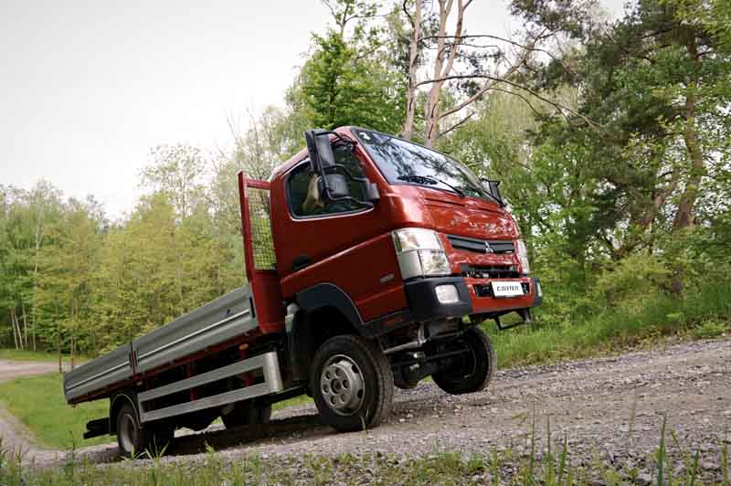Fuso Canter 4x4 – Leichte Geländearbeit04.06.2012 Mit dem Canter 4x4 hat die Mitsubishi Nutzfahrzeugmarke Fuso einen kompakten Allrad-Lkw für den Einsatz im leichten Gelände kreiert. Dank einem durchzugsstarken 175 PS starken Dreiliter-Turbodiesel, einem hochgelegten Chassis mit ordentlicher Bodenfreiheit sowie einem zuschaltbaren Allradantrieb kraxelt der 6,5-Tonner erstaunlich behände über Stock und Stein. Wir stehen am Fuß einer asphaltierten Steigung im Unimog-Versuchsgelände in Ötigheim bei Rastatt. Ein Hinweisschild spricht von „30 Prozent“ und empfiehlt den ersten Gang zum Hinaufkraxeln. Klar, bei zugeschaltetem Frontantrieb. Wir sitzen in einem kleinen 6,5-Tonner Lkw. Unter der Haube ein Dreiliter-Vierzylinder mit Common-Rail-Einspritzung und Turbolader inklusive variabler Schaufelradgeometrie, der darauf wartet, die Kraft seiner 430 Newtonmeter Drehmoment ausspielen zu können. Auf der Ladefläche dieses Einzelkabiners sind rund drei Tonnen Ballast verzurrt. Eigentlich sollte dieser Allradler das locker packen… Also los! Und bloß nicht stehen bleiben oder schalten! Schön gleichmäßig laufen lassen, mittlere Drehzahl, nicht unter- oder übertourig fahren. Und schon stehen wir oben. Fein hat er das gemacht, dieser Mitsubishi Fuso Canter 4x4. Ganz ohne Untersetzung. Sie wundern sich?! Okay: Das Logo mit den drei Diamanten auf dem Kühlergrill kennen Sie als traditionell gebildeter Offroader bislang nur von bewährten Allradlern mit Namen Pajero, L200, Outlander, ASX oder Lancer. Der Fuso Canter 4x4 ist da ein Novize in der Familie und streng genommen auch gar nicht deren Mitglied: Denn die Nutzfahrzeugsparte des japanischen Herstellers Mitsubishi gehört seit 2006 zur Truck Division des Daimler-Konzerns. Weshalb man die Canter-Baureihe, die mittlerweile seit 1963 gebaut wird, beim freundlichen Mercedes-Nutzfahrzeug-Händler bekommt. Das aktuelle Modell repräsentiert übrigens schon die neunte Generation dieses leichten Lkw. Doch es ist die erste, die hierzulande mit Allradantrieb angeboten wird.