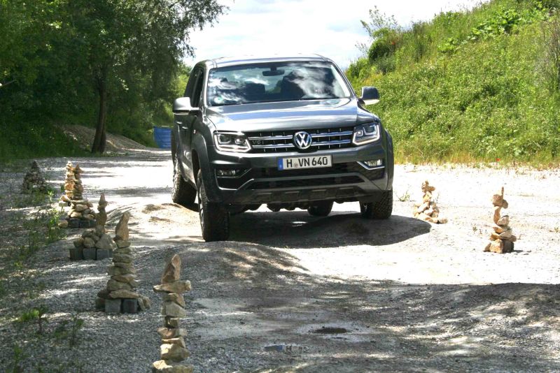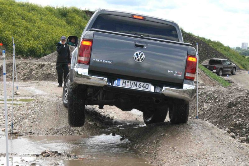 Unterstützt wird der Amarok bei seinen Offroad-Touren von einem ganzen Paket mechanischer und elektronischer Helferchen: Das Losfahren an Steigungen erleichtert eine Berganfahrhilfe, talwärts bremst ein Bergabfahrassistent den Pickup ein. Per Tastendruck auf der Mittelkonsole wird die „Offroad“-Funktion des ABS aktiviert, das durch längere Regelintervalle den Bremsweg auf losem Untergrund deutlich verkürzt. Die serienmäßige elektronische Differentialsperre (EDS) verhindert durch automatische Bremseingriffe das einseitige Durchdrehen der Räder in heiklen Verschränkungspassagen, optional ist darüber hinaus eine mechanische Hinterachs-Differentialsperre für den Amarok zu haben.