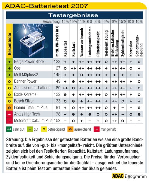 Bei dem vom ADAC zusammen mit europäischen Partnerclubs und der Stiftung Warentest durchgeführten Test konnten nur drei Batterien überzeugen: die Berga Power Block, die Original-Ersatzteilbatterie von Opel und die Moll M3plusK2. Untersucht wurden im Test zehn Kriterien, die Auskunft geben über die Leistungsfähigkeit der Batterie, die Haltbarkeit und die Sicherheit. Vor allem auf das Kaltstartverhalten (Testsieger Opelbatterie), die Kapazität, also das Speichervolumen der Batterie (Arktis Qualitätsbatterie) und auf die Zyklenfestigkeit (fünfmal „sehr gut“) wurde mit 45 Prozent Gewichtung besonderes Augenmerk gelegt. Unter Zyklenfestigkeit versteht man die Fähigkeit der Batterie, möglichst viele Lade- und Entladevorgänge zu verkraften. In der Praxis liefert dieser Wert einen wichtigen Hinweis auf die Langlebigkeit einer Batterie.