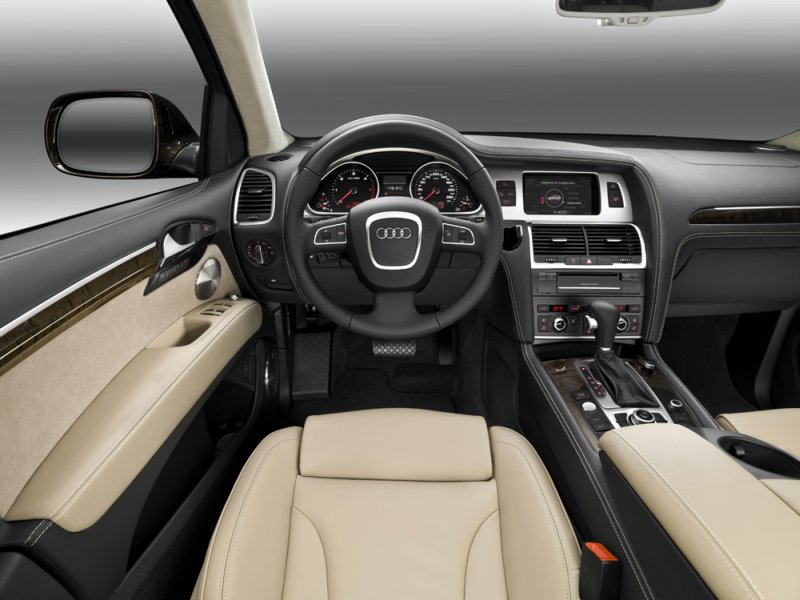 Audi Q7 – Diätkur für den Dicken05.05.2009 Optisch überarbeitet, innen aufgewertet und mit sparsameren Motoren unter dem Blech startet das große Audi SUV in die Zukunft. Von vorne erkennt man die aufgefrischte Generation des Audi Q7 am neu gestalteten Singleframe-Kühlergrill sowie den überarbeiteten Stoßfängern. Neben den serienmäßigen Halogenscheinwerfern bietet Audi für den Q7 auch eine Xenon plus-Variante und eine neue „adaptive-light-Ausführung“ an, die neben dem Abblend-, Fern- und einem speziellen Autobahnlicht auch ein Abbiege- und Kurvenlicht integriert. Am Heck ist der untere Teil des Stoßfängers nun in Kontrastfarbe lackiert; die Heckklappe ist im Bereich des Kennzeichens neu gezeichnet und besteht nun aus Aluminium, ebenso wie die Motorhaube und die Kotflügel. Im Innenraum präsentiert sich der Instrumenteneinsatz neu gezeichnet, die Runduhren tragen Rähmchen in Metallic, und zahlreiche Bedien-Details wurden durch Chromelemente aufgewertet. Neue Farben und Materialien runden die Auffrischung des Interieurs schließlich ab.