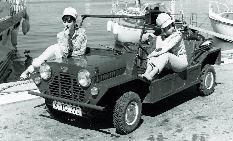 Schon 1964, nur fünf Jahre nach der Markteinführung des Ur-Mini, präsentierte dessen Schöpfer Alec Issigonis eine rundum offene Variante des revolutionären Kleinwagens. Die Karosserie des Mini Moke bestand aus wenig mehr als einer Bodenwanne, breiten seitlichen Schwellern, Motorhaube und Windschutzscheibe. Gegen Niederschläge schützte ein aufklappbares Verdeck. Mit seiner robusten Bauweise und der Antriebstechnik des Mini wurde der spaßorientierte Viersitzer vor allem in den sonnenverwöhnten Regionen der USA und in Australien zum Erfolg.
