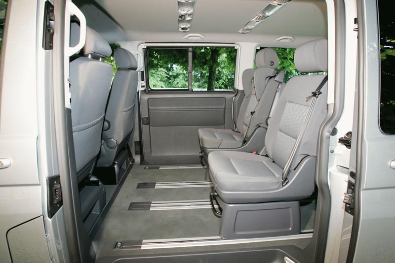 Tragendes Element ist dabei der verlängerte Multivan-Boden mit seinen eingelassenen Schienen. Darauf lässt sich die Einrichtung - ob serienmäßige Sitzbank, serienmäßig und optionale Einzelsitze, Multifunktionstisch oder Isolierbox – beliebig verschieben und sicher arretieren. |