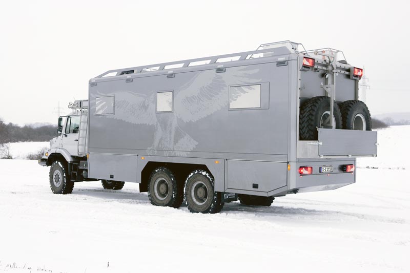 Mercedes-Benz Zetros: Zwei 6x6 als Luxus-Jagdmobil in die Mongolei / Seite 2Das Chassis verkraftet von Haus aus eine Nutzlast von 16 Tonnen: Eine ideale Vorraussetzung für die Anforderungen, die die beiden Jäger an die Luxuseinrichtung ihrer Jumbo-Offroader stellten: Die Isolierung sollte die extremen Temperaturschwankungen in Gebirge und Wüste ausgleichen, die Inneneinrichtung alle Erschütterungen und Verwindungen verkraften. Der Aufbau kommt von der Alsfelder Firma Hartmann Spezialkarosserie, den individuellen Ausbau übernahm Huenerkopf aus Neunkirchen. Beide Fahrzeuge sind weitestgehend identisch aufgebaut und mit Schlafzimmer, Leder-Sitzgruppe, einem Luxus-Bad inklusive Fußbodenheizung sowie einer kompletten Küche sowie einem Safe und einem Waffenschrank eingerichtet. Für die Temperierung sorgen eine kompressorbetriebene Klimaanlage sowie eine Diesel-Heizung. Weitere Features der beiden knapp 11 Meter langen, 2,70 m breiten und 4,20 Meter hohen sowie jeweils rund 800.000 Euro teuren Jagdwagen: Frischwassertanks mit einem Gesamtvolumen von 250 Liter, ein 100-Liter-Abwassertank, zwei 200 und 300 Liter große Dieseltanks, Dachträger mit 100 kg Höchstlast sowie ein Heckträger mit Lift für zwei Ersatzräder. |
