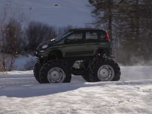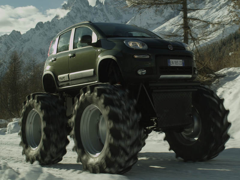 Fiat Panda 4x4 Bigfoot – Bärchen im Monsterlook11.12.2012 Der höchste Panda aller Zeiten entstand aus der Kreuzung mit einem Jeep CJ 7. Anfang 2013 wird der Bigfoot als Star in einem Werbespot auftreten, der die Fähigkeiten des Serien-Panda 4x4 mit Humor in Szene setzt. Von der amerikanischen Allrad-Ikone stammt das Chassis, das mit überdimensioniertem Fahrwerk sowie speziellem Antriebsstrang und verlängerter Lenkung auf die Dimensionen eines Monster-Truck modifiziert wurde. Darauf haben die Spezialisten von Mercurio Cinematografica die Karosserie eines Fiat Panda gesetzt. Nur rund zwei Wochen nahm die Verwandlung in Anspruch. Die grobstolligen Reifen sind bei einem Durchmesser von 1,50 Metern volle 50 Zentimeter breit. Das gesamte Gefährt ist 3,90 Meter hoch und 3,80 Meter lang. So wird das Aussteigen aus mehr als zwei Meter Höhe – wie man im italienischen Werbespot sehen wird – zur ganz besonderen Aufgabe. |