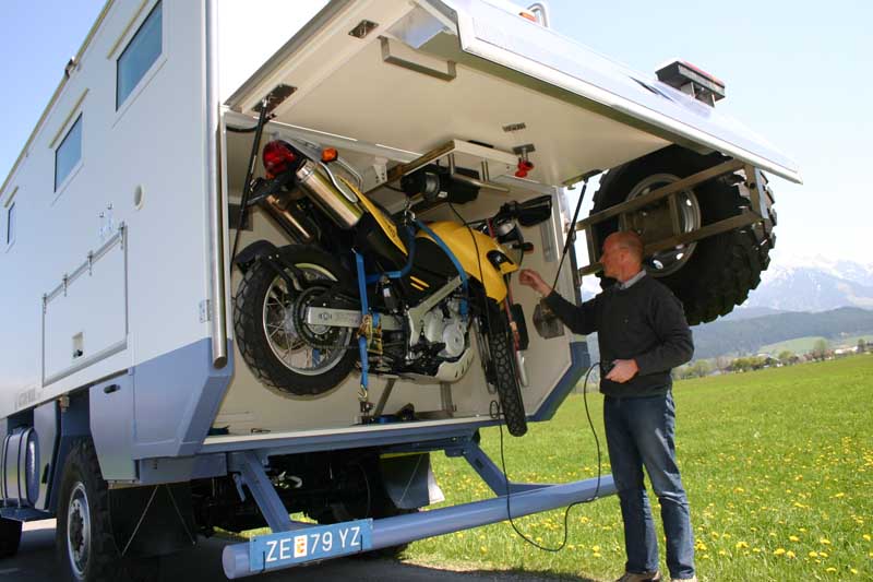 Dank eines ausziehbaren Lifts ist das Verladen eines schweren Geländemotorrads in den Ashanti von Action Mobil ein Kinderspiel.
