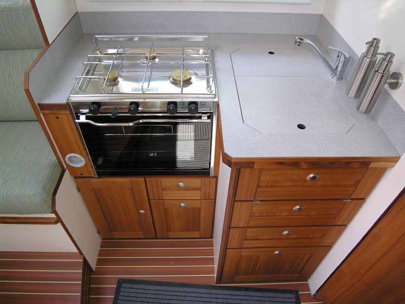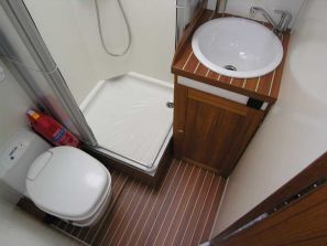 Bocklet – Der Bücherbus - Seite 3Gegenüber dem Einstieg, auf der linken Fahrzeugseite also, ist die Winkelküche mit Dreiflammkocher, Backofen und zwei Spülbecken platziert. An sie schließt sich nach vorn das gut durchdachte Bad an, bei dem Waschbecken und Kassetten-Toilette die Haushalts-Dusche einrahmen. Diese Anordnung schafft sehr viel Bewegungsfreiheit bei zurück geschobenen Duschtüren, ermöglicht aber auch die Benutzung von Toilette und Waschbecken bei geschlossener Duschkabine – etwa, wenn hier man hier just nasse Klamotten zum Trocknen aufgehängt hat. Den Platz gegenüber dem Hygienebereich belegt die Schrankzeile mit zwei Kleiderschränken vorne. Direkt neben dem Einstieg öffnet sich der 110-Liter-Kompressor- Kühlschrank, auf dessen Oberseite der TV-Flachbildschirm einen prima Platz findet. Zwischen der Schrankzeile und dem Bad verschließt eine stabile Tür den Weg vom und ins Fahrerhaus. Von außen ist dieser Durchgang mit einem Faltenbalg abgedichtet, der die unterschiedlichen Bewegungen von Fahrerhaus und Wohnaufbau auf unebener Fahrbahn ausgleicht.