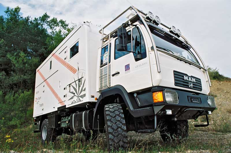 Als Basis haben sich Atz und sein Kunde für einen MAN 10.225 LAEC entschieden, dessen 162 kW (220 PS) starker Sechszylinder-Turbodiesel ein Gesamtgewicht von zehn Tonnen zu „stemmen“ hat. Er ist so gut wie mit allem ausgestattet, was die MAN-Sonderausstattungsliste hergibt: Oberhalb des Rahmens sind das unter anderem ein langes Fahrerhaus mit Klimaanlage, luftgefederten und beheizten Komfortsitzen, beheizten Außenspiegeln, Pollenfilter und Batterietrennschalter im Fahrerhaus.