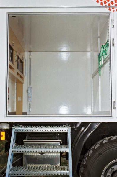 Tartaruga – Der Service-Renner - Seite 4Im Fahrerhaus ist das allradgetriebene Service-Reisemobil mit zwei Navigationssystemen, Rallye-Tripmaster, Kompressor-Kühlbox und Rückfahrvideosystem ausgestattet. Außen umschließen Astabweiser aus Edelstahl den Wohnaufbau und das Fahrerhaus. Der Überbau auf dem Fahrerhaus trägt zusätzliche Dach- und einen Suchscheinwerfer sowie das Reserverad, das mittels Kran herunter gelassen bzw. nach oben gehievt wird. Rundum sorgen Arbeitsleuchten für ausreichende Helligkeit während der Servicearbeiten. Seitlich am Rahmen sind die Gel-Batterien und der Stromgenerator untergebracht. Am Heck gibt der hochgeklappte Unterfahrschutz eine mit 3,5 Tonnen belastbare Anhängevorrichtung für den Transportanhänger des Wettbewerbsfahrzeugs frei. Und in der Heckgarage parkt ein weiteres Fahrzeug: ein Allrad-Quad, das die Besatzung mittels Seilwinde über Auffahrrampen einziehen oder herausrollen kann.