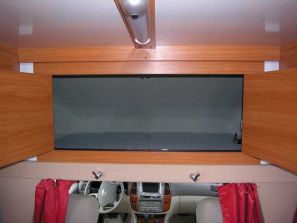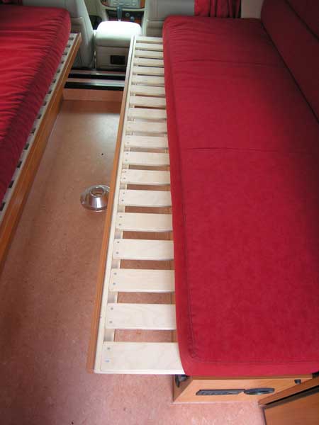 Im Handumdrehen sind die Sitzkissen samt Lattenrost-Unterlage in den Mittelgang gezogen – der Esstisch wird zuvor in die Transport-Halterung an der Waschraumwand geschoben – und die unteren Hälften der Rückenkissen daneben gelegt. Schon sind zwei Einzelbetten mit den Längen 200 und 190 Zentimeter und der einheitlichen Breite von 85 Zentimeter fertig, auf die man nur noch die Bettwäsche legen muss, die ansonsten im großen Staufach über dem Fahrerhaus gebunkert wird.
