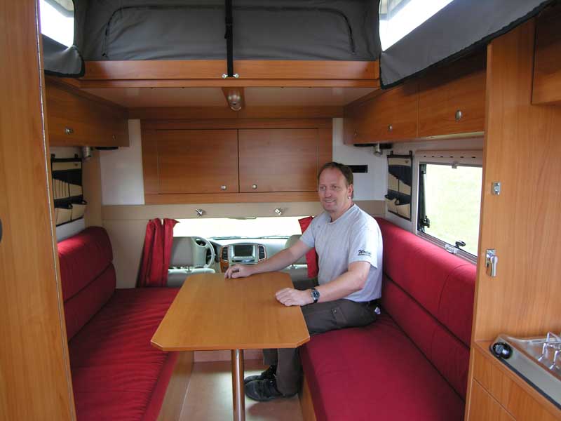 An das Fahrerhaus schließt sich – mit offenem Durchgang auf ganzer Breite und Höhe - die 1,90 Meter lange Gegensitzgruppe mit dem wegschwenkbaren Esstisch an. Sie lässt sich zur Schlafstatt mit Einzelbetten umbauen.