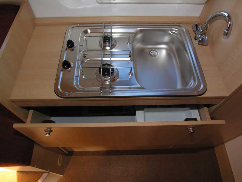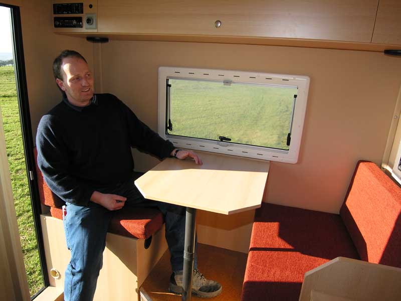 Woelcke Hilux Travel - Das Leichtgewicht - Seite 2In die Kabine steigt man über eine hinter der Hinterachse angestellte Leiter. Hinten quer erstreckt sich die Sitzgruppe. In dem in Fahrtrichtung rechts platzierten Einzelsitz steckt die Boiler-Heizungs-Kombination Truma C 4002. In der linken, breiteren Sitzbank sind die zwei 11 kg-Gasflaschen untergebracht. Der an der Rückwand angeschlagene Klapptisch steht auf einem Podest, das als Stauraum zur Verfügung steht. Vor der Sitzgruppe stehen auf der linken Seite das Küchenmöbel mit Zweiflammkocher-Spüle-Kombination und der Kombischrank, der unten ein Kleiderfach und darüber ein kompressorbetriebenes Kühlabteil mit 45-Liter Volumen beherbergt.
