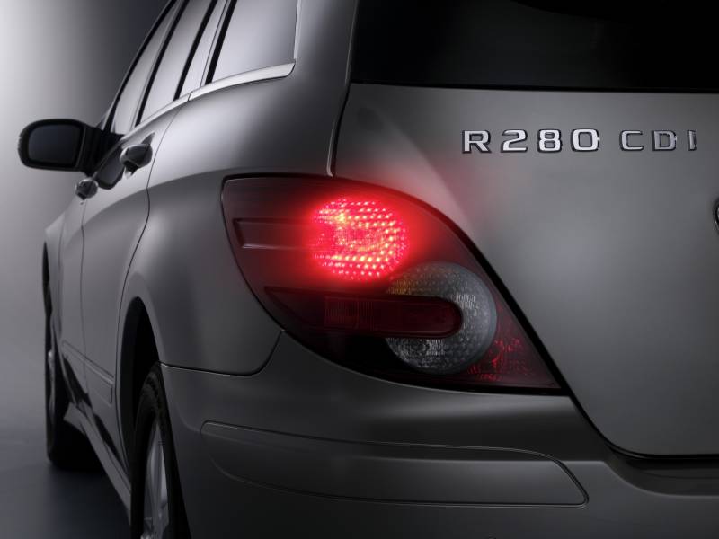 Bremsleuchten, die bei einer Notbremsung schnell blinken, sind neu in der Sicherheitsausstattung der R-Klasse. Mercedes-Ingenieure haben diese Technik entwickelt, um Autofahrer wirksamer als bisher vor einem drohenden Auffahrunfall zu warnen. Untersuchungen bestätigen, dass Fahrer im Durchschnitt um bis zu 0,2 Sekunden schneller reagieren, wenn in Notbrems-Situationen statt des herkömmlichen Bremslichts ein rot blinkendes Warnsignal erfolgt.