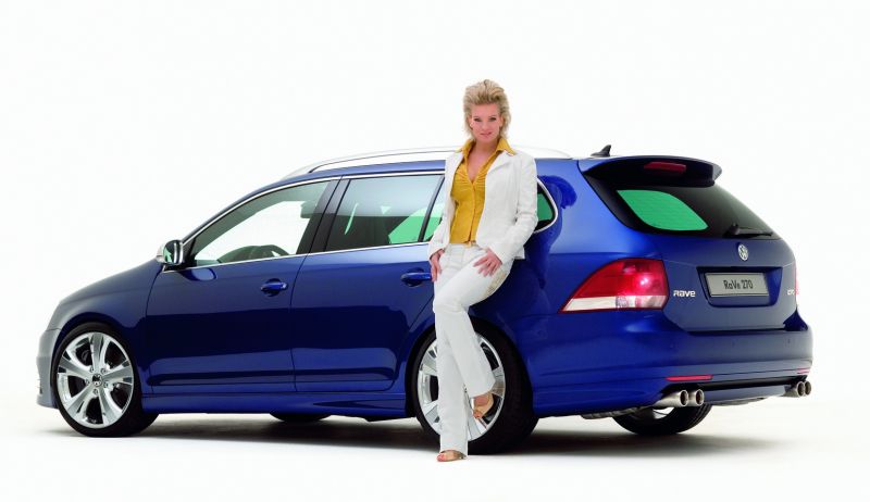 Der Golf Variant RaVe 270 steht für 270 PS, modifiziertes Design im Motorsport-Stil und eine sehr sportlichen Ausstattung. So wird der veredelte Volkswagen vom leistungsgesteigerten Motor des Golf GTI und dem 4Motion-Allradantrieb des Golf R32 beflügelt. Nach nur 5,8 Sekunden ist der Golf Variant RaVe 270 bereits 100 km/h schnell. Erst bei 250 km/h wird einer weiteren Beschleunigung elektronisch Einhalt geboten. Trotz der sportlichen Fahrleistungen beträgt der Durchschnittsverbrauch des Golf Variant RaVe 270 lediglich 9,1 Liter auf 100 Kilometern.