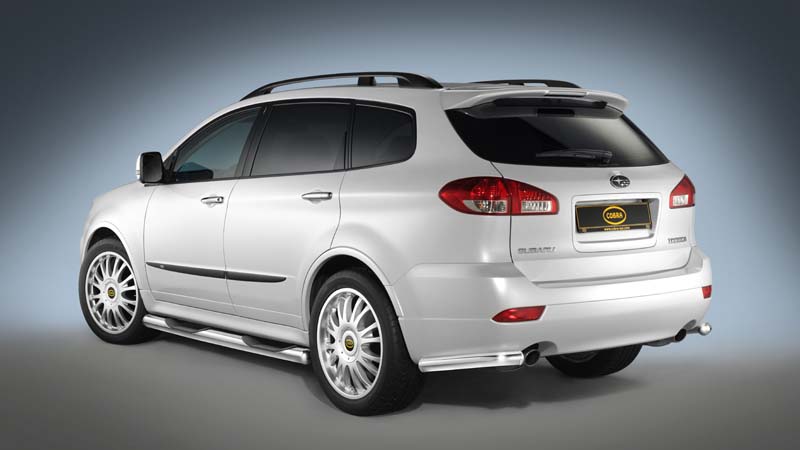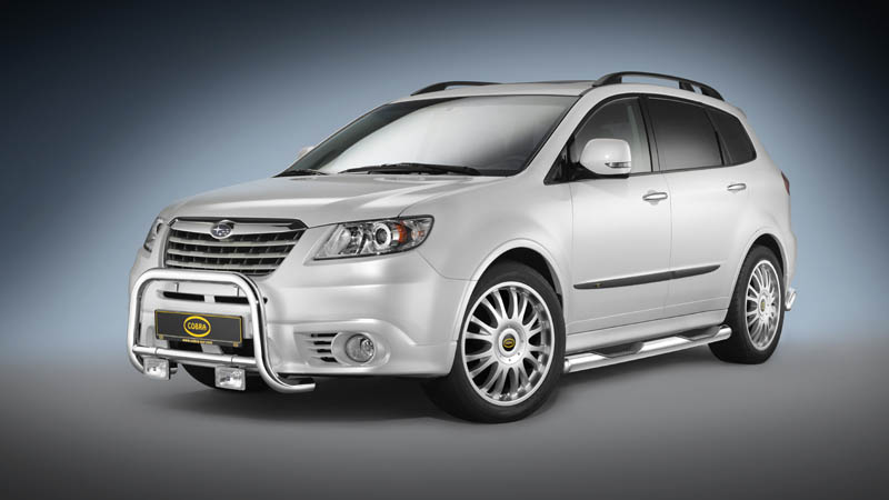 Nach VW Tiguan, Mazda CX-7, dem Trio aus Mitsubishi Outlander/Peugeot 4007/Citroën C-Crosser oder Dogde Nitro wird nun auch der Subaru Tribeca nach seinem Facelift als jüngster Neuzugang im Styling-Programm geführt. Für den großen Japaner haben die Cobra-Techniker einen Frontbügel aus 60 Millimeter dickem Edelstahlrohr maßgeschneidert, der die strenge EG-Richtlinie 2005/66/EG für bestmöglichen Fußgängerschutz erfüllen soll. Dank seiner flexiblen Befestigung an der Karosserie gibt er nach Aussage des Herstellers bei einer Kollision nach und mindert dadurch das Verletzungsrisiko. Gleiches gilt für die beiden Edelstahlbügel, die links und rechts an der Heckschürze montiert werden. Die klassischen Schwellerrohre, aus 80 mm dickem Edelstahl gefertigt, sollen mit ihren Kunststoffauflagen nicht nur den Passagieren als Ein- und Ausstiegshilfe dienen, sondern bei Geländeausflügen auch die Flanken des Allradlers vor Beschädigung schützen.